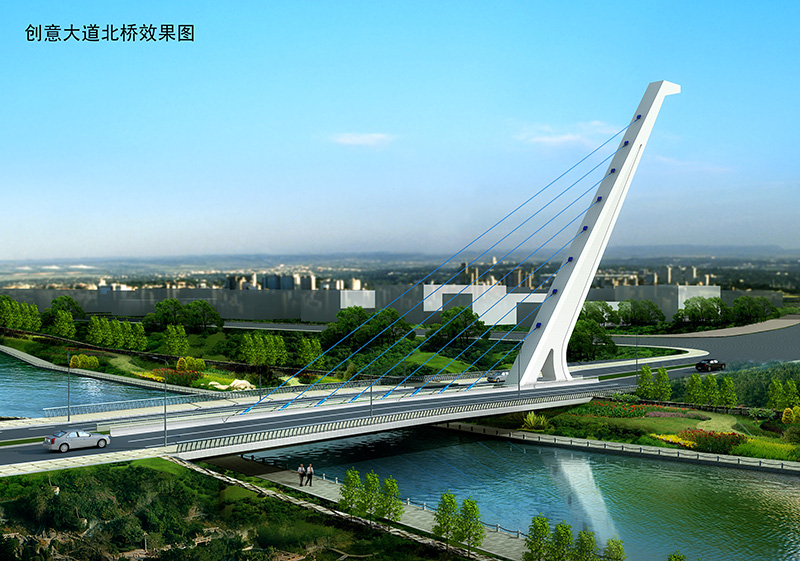 匯智橋路南、北橋均為無背索獨塔單索面斜拉橋,橋跨 82 米,全寬 33.5 米;智力島路橋為單跨新型斜靠式拱
